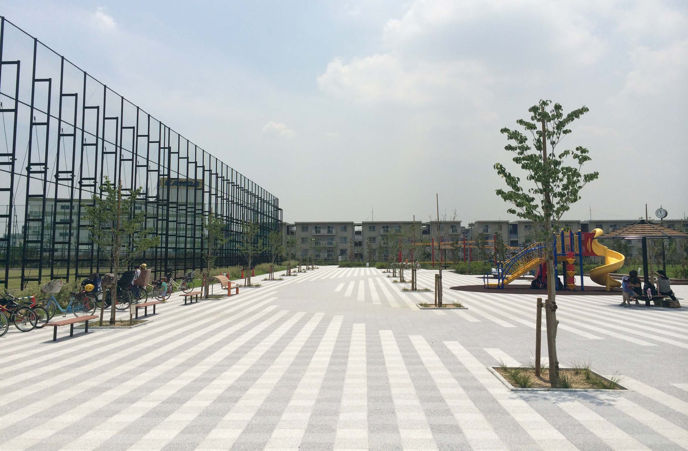 ブロックの色の使用方法で園路を表現したりと、シンプルの中にも遊びごころがある公園。 関連製品:アースクルーSLIT