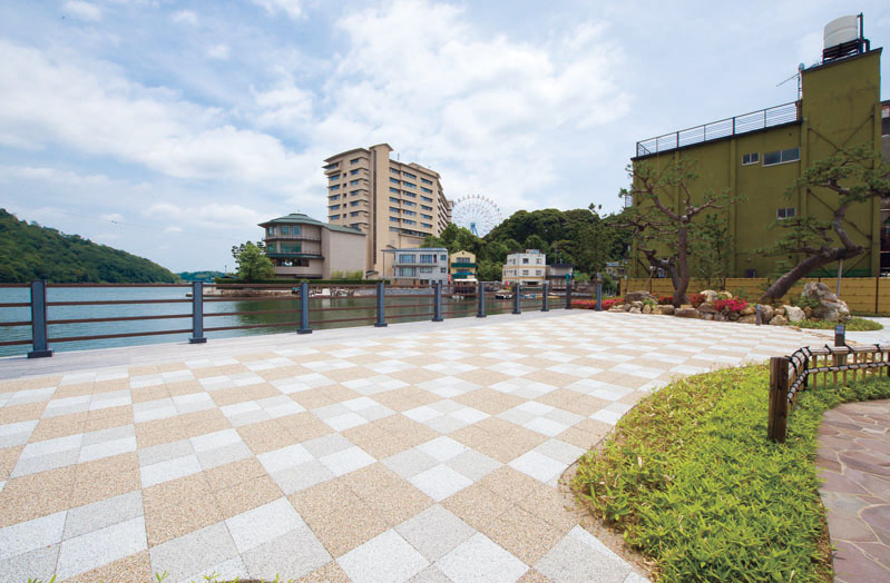 洗い出しブロックの素材感とデザインが、温泉街の和の雰囲気にマッチしています。 関連製品:侘